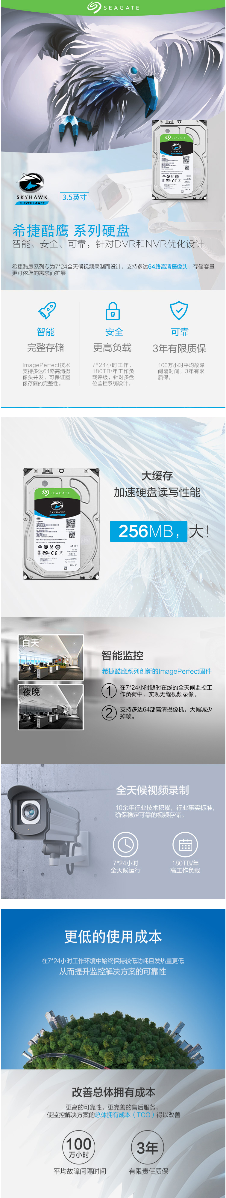 希捷(seagate)6TBSkyHawk酷鹰监控硬盘256MB5400转SATAST6000VX001